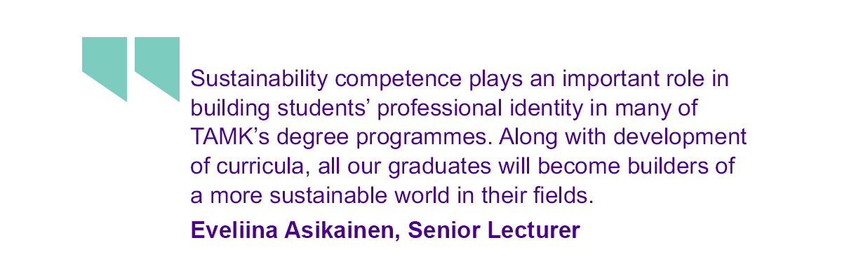 Strengthening of sustainability competence is an important viewpoint in TAMK’s curriculum process. The curriculum work aims at offering all TAMK graduates abilities in promoting sustainable development in their professional life and taking working life comprehensively towards a more sustainable direction.