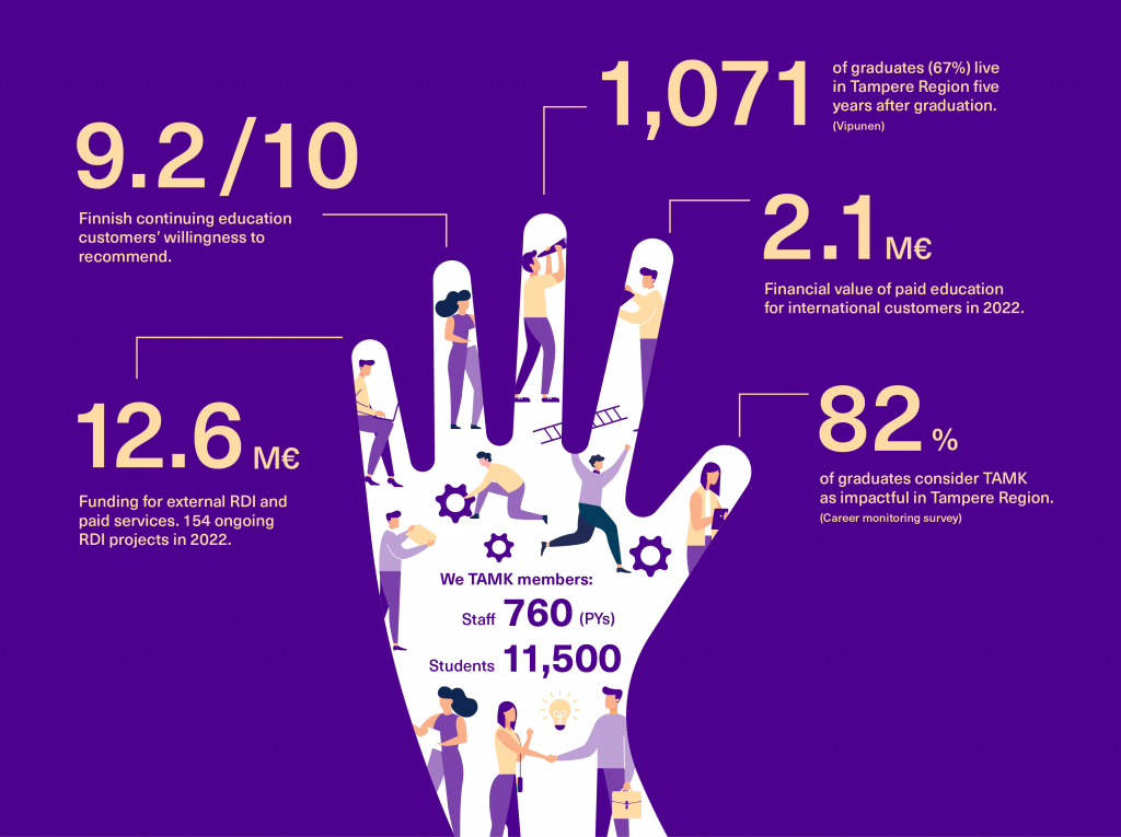 Our operation is extensive and impactful. TAMK produces new competence for the region since as many as 67% of graduates still live in the Tampere Region five years after graduation. 82% of the graduates also consider that TAMK is an impactful regional player.