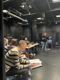 Kuva: Viljami (etualla) kertoo, että harjoituksissa kohtaukset videoitiin, jotta näyttelijät voivat harjoitella osuuksiaan itsenäisesti niiden pohjalta. Taustalla myös ohjaajat Samuel ja Petrus.