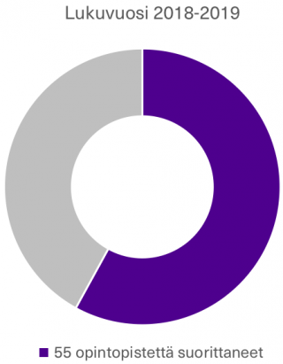 55 opintopistettä suorittaneet opiskelijat Lukuvuosi 55 op suorittaneiden osuus 2016/2017 62 % 2017/2018 63 % 2018/2019 58 % Lähde: extra.vipunen.fi