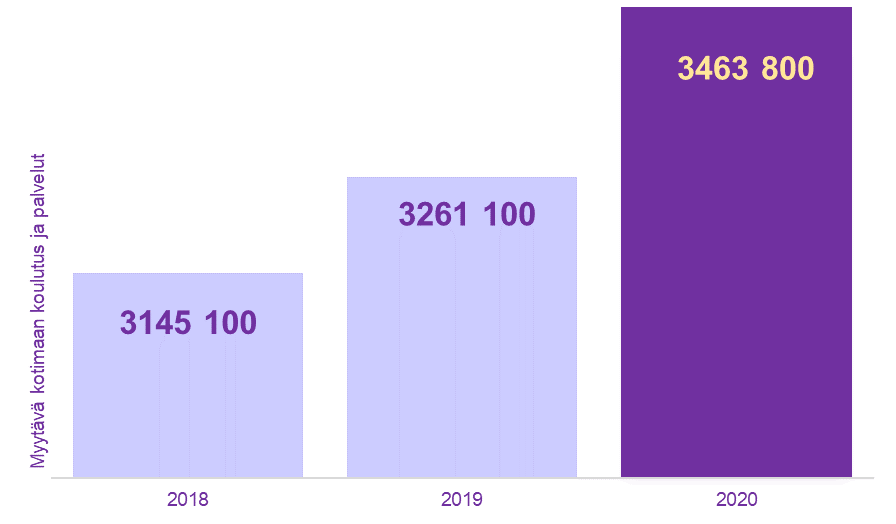 Myytävä kansainvälinen koulutus on ollut kasvussa viime vuosina. Koronapandemia heikensi tilannetta huomattavasti vuonna 2020. EU/ETA-maiden ulkopuolelta tulevien lukuvuosimaksua maksavien opiskelijoiden määrä on kuitenkin kasvanut ja niiden osalta tuotot lisääntyneet. Kokonaisuutena myytävän kansainvälisen koulutuksen tilanne heikkeni vuodesta 2019. Koulutusviennin lukuja esitellään tarkemmin Kansainvälisyys-osiossa.