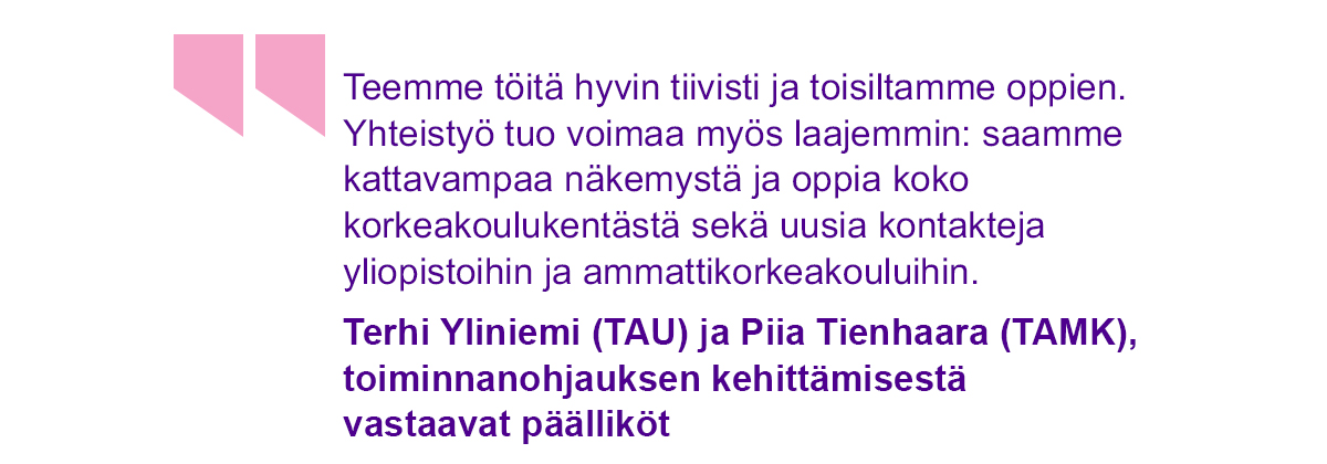 Tampereen ammattikorkeakoulun tuoreen 2030-strategian yhtenä päätavoitteena on hyödyntää korkeakouluyhteisön kilpailuedut. Myös kriittisissä menestystekijöissämme tavoitteiden saavuttamisen edellytyksenä on, että TAMK vahvistaa kilpailukykyään osana Tampereen yliopiston kanssa muodostettua tamperelaista korkeakouluyhteisöä.