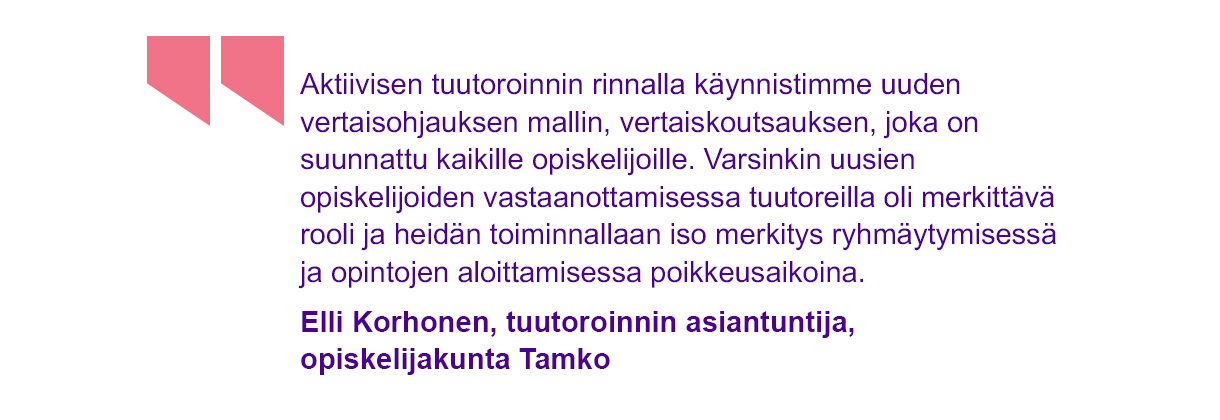 Opiskelijoiden tuen tarve korostui vuoden aikana, ja tähän vastasimme kehittämällä vertaistukea ja hyvinvointipalveluja tiiviissä yhteistyössä opiskelijakunta Tamkon kanssa.