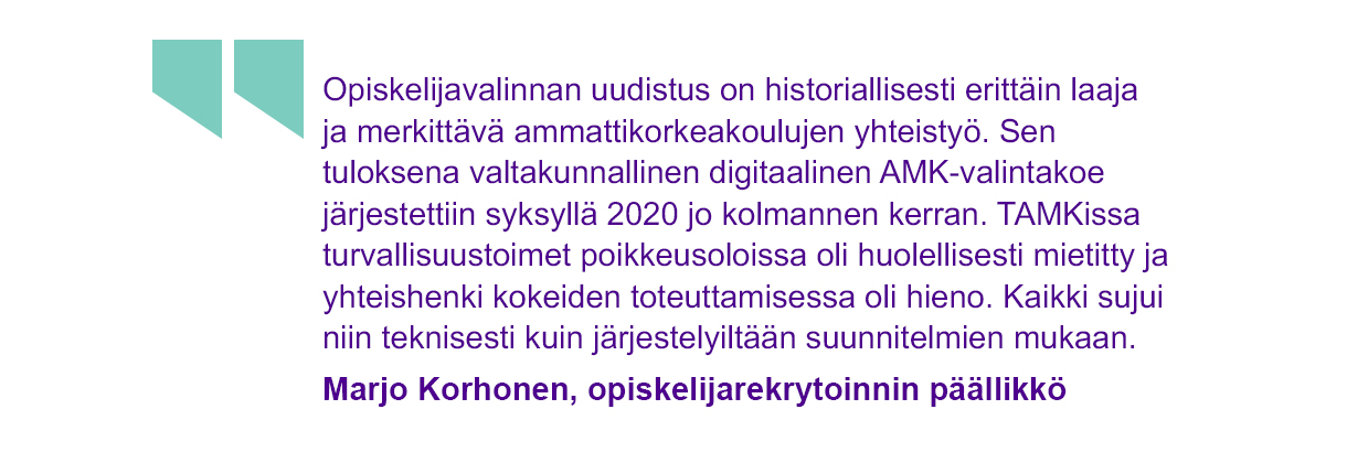 Ammattikorkeakoulujen yhteisessä hankkeessa työstetty valtakunnallinen AMK-valintakoe toteutettiin kesällä ensimmäistä kertaa täydessä laajuudessaan mutta kaksivaiheisena. Sähköisen valintakokeen toinen vaihe toi TAMKiin kesäkuussa lähes 2000 hakijaa, ja kokeita järjestettiin kolmena päivänä ottaen huomioon koronaepidemian aiheuttamat mittavat turvallisuustoimet. Syksyllä koe järjestettiin yksivaiheisena ja noin 1500 hakijaa teki kokeen TAMKilla.