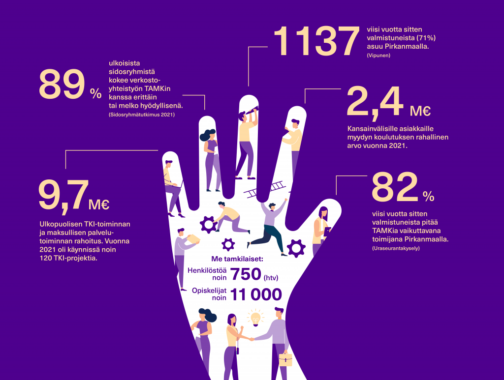 Tervetuloa Tampereen ammattikorkeakoulun vuosikatsaukseen. Näillä sivuilla voit lukea vuoden 2021 tuloksestamme, saavutuksistamme ja arjen tekemisemme kohokohdista.