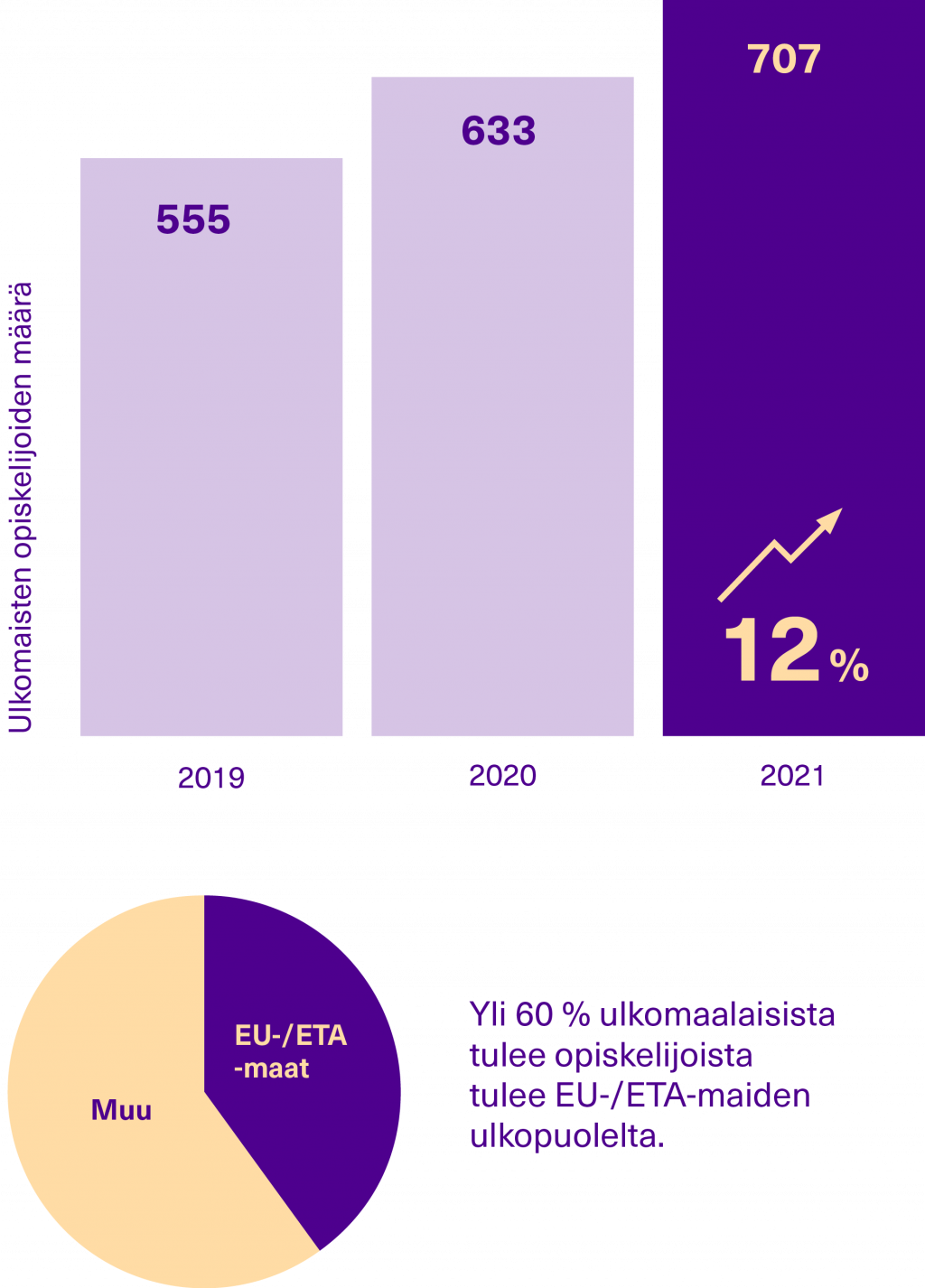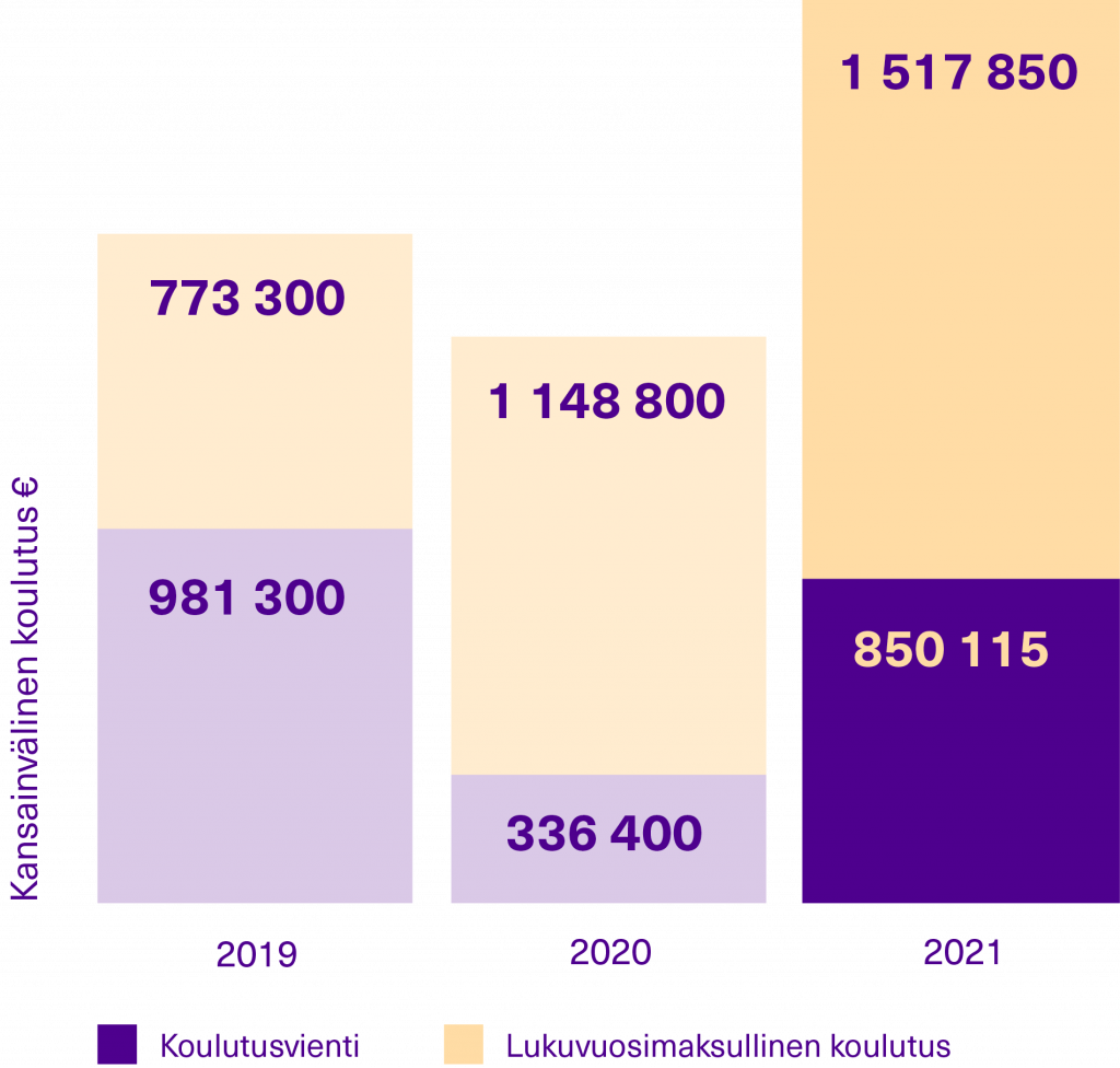 Myytävän kansainvälisen koulutuksen kasvua selittää erityisesti EU- ja ETA-maiden ulkopuolisten tutkinto-opiskelijoiden määrän lisääntyminen. Tärkeää on kuitenkin, että myös koulutusviennin osalta lähestyttiin vuoden 2019 tasoa.