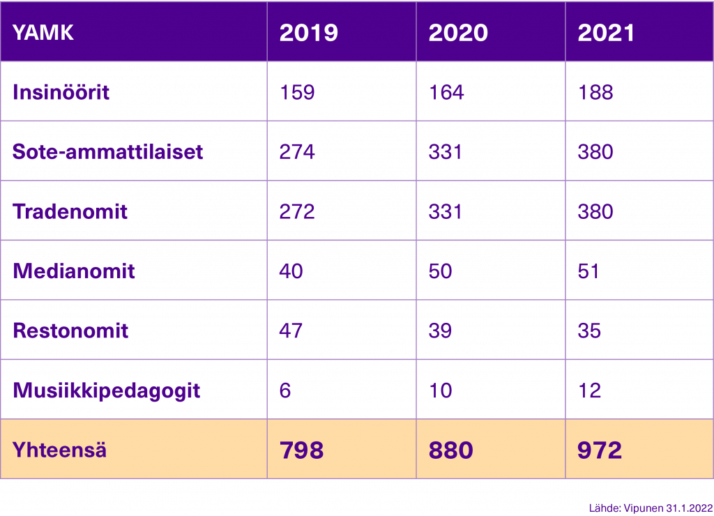YAMK-opiskelijoiden määrä on kasvanut lähes 100 opiskelijalla vuodessa viimeisen kahden vuoden aikana. Vuonna 2021 YAMK-opiskelijoiden määrä oli 972.