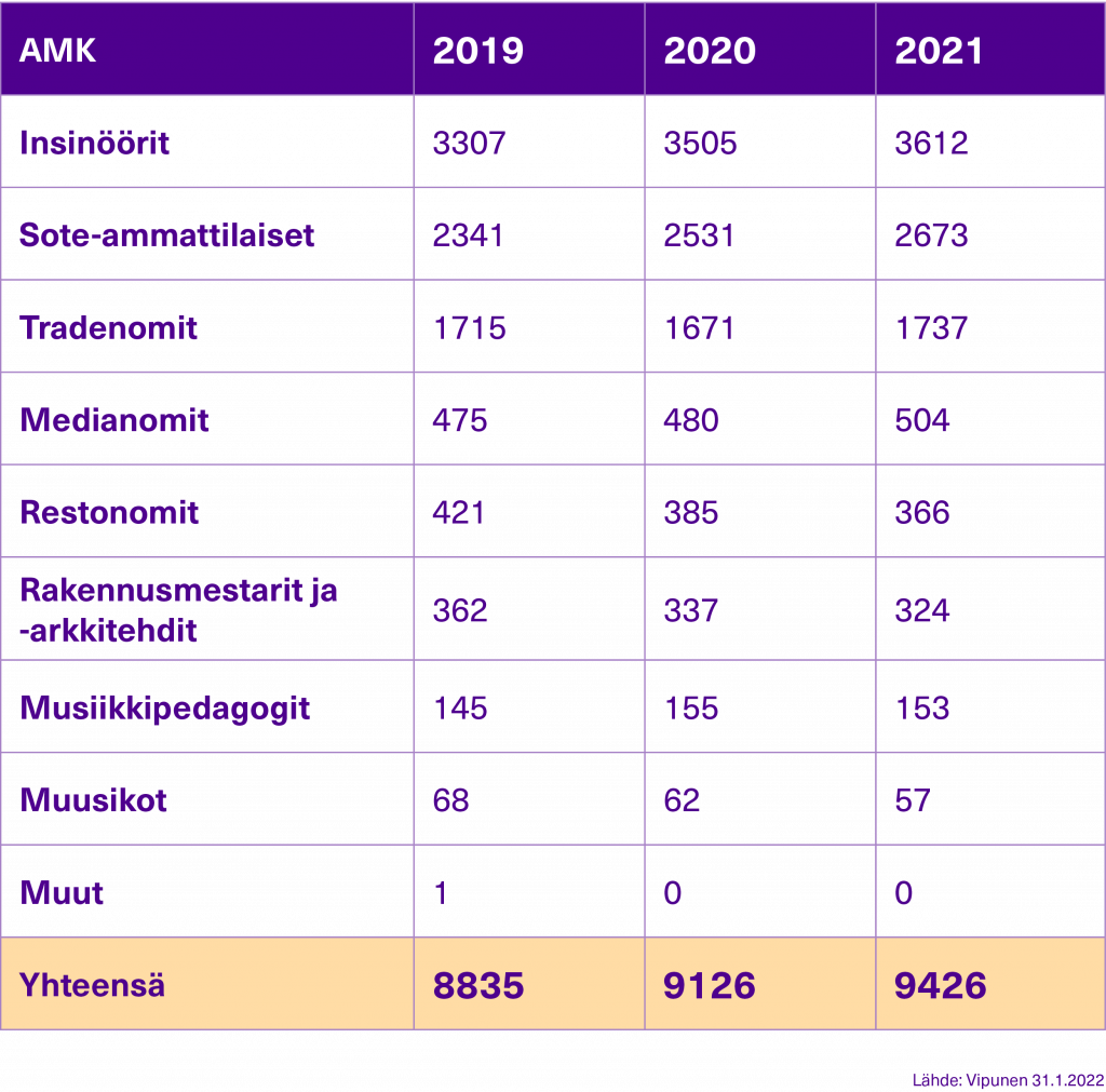 AMK-opiskelijoiden määrä on kasvanut kahtena viime vuonna noin 300 opiskelijalla vuodessa. Vuonna 2021 AMK-opiskelijoita oli 9426.