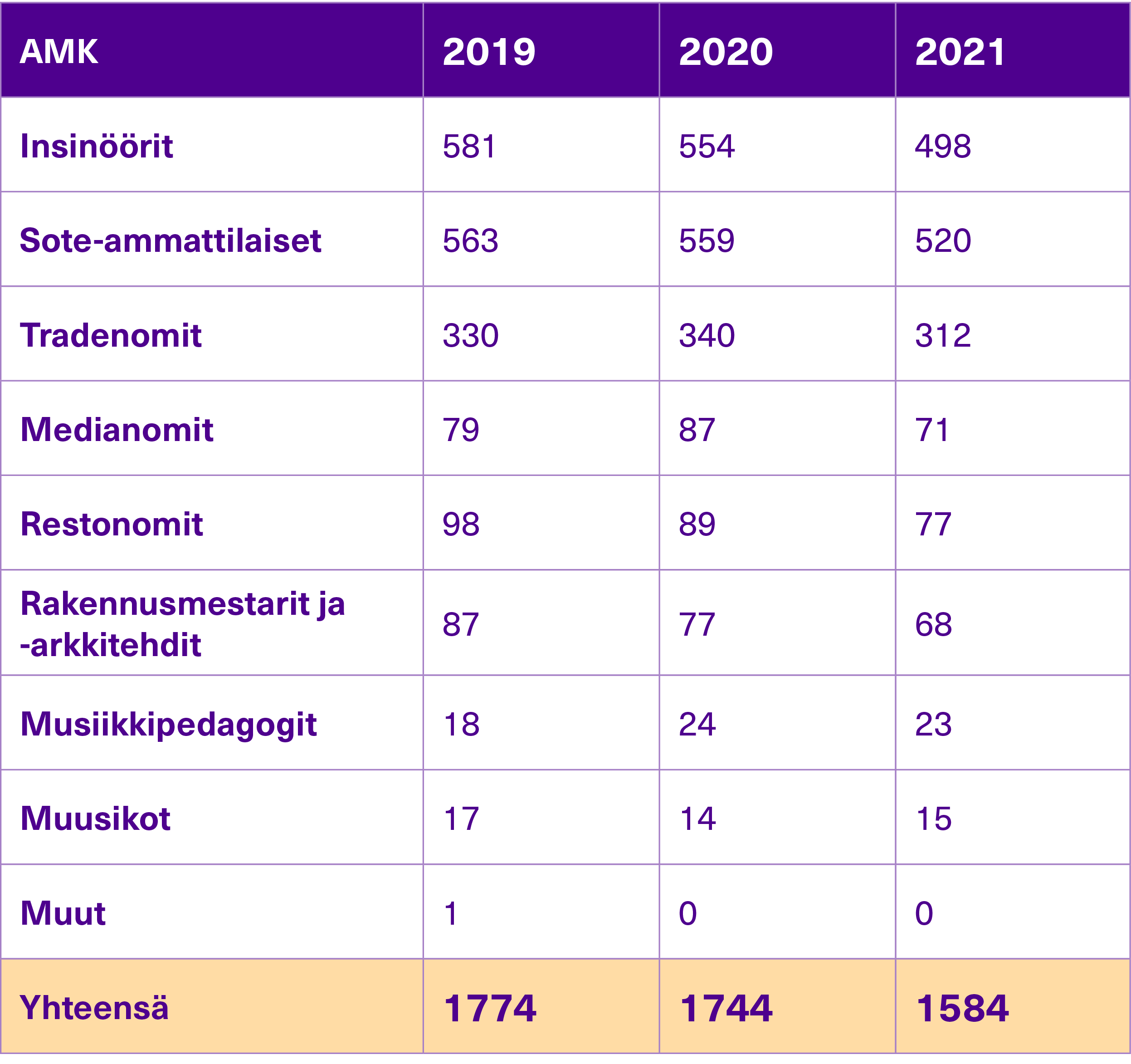 AMK-tutkinnon suorittaneiden määrä jäi vuonna 2021 alle 1600 valmistuneeseen. Kahtena aiempana vuotena tutkintomäärä on ollut suunnilleen 1750.