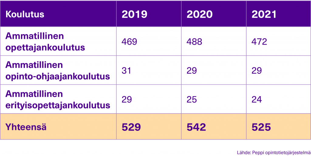 Ammatillisen opettajankoulutuksen suorittaa vuosittain noin 240 henkilöä. Valtaosa suorittaa ammatillisen opettajankoulutuksen ja noin 20 opinto-ohjaajan tai erityisopettajan koulutuksen.