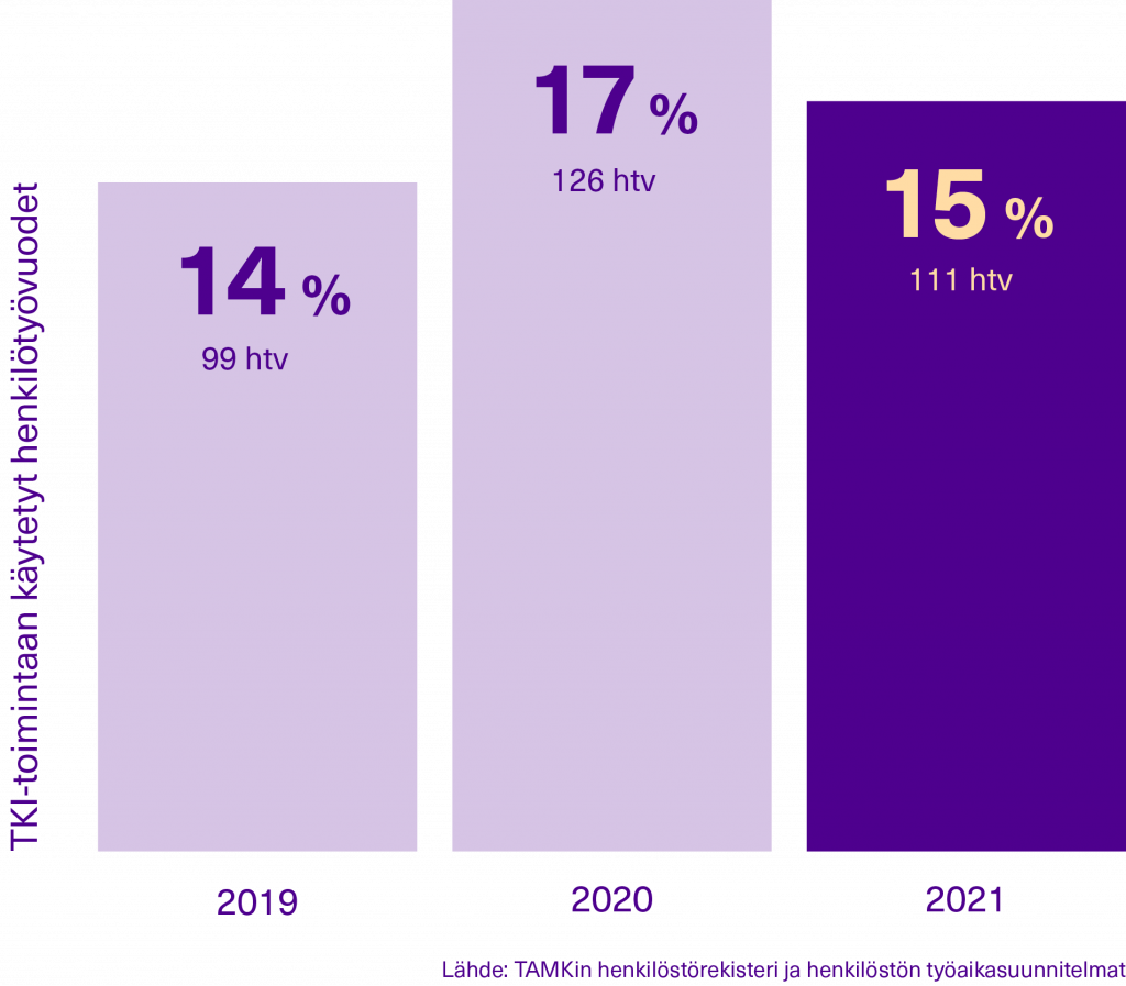 Vuonna 2021 TAMKin päätoimisen henkilöstön henkilötyövuosista 15 % (111 htv) käytettiin tutkimus-, kehitys- ja innovaatiotoimintaan (TKI). TKI:hin käytetty henkilötyövuosimäärä on pienentynyt vuoteen 2020 verrattuna 12 %, mutta se on edelleen paremmalla tasolla kuin sitä aiempina vuosina.