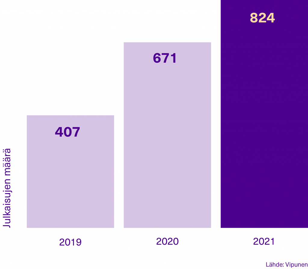Vuonna 2020 luotu julkaisuihin liittyvä kannustinjärjestelmä innosti edelleen erityisesti blogikirjoitusten julkaisemiseen. Julkaisujen määrä nousi edelleen ennätystasolle, 824 julkaisuun. Julkaisujen määrä on kahdessa vuodessa tuplaantunut.