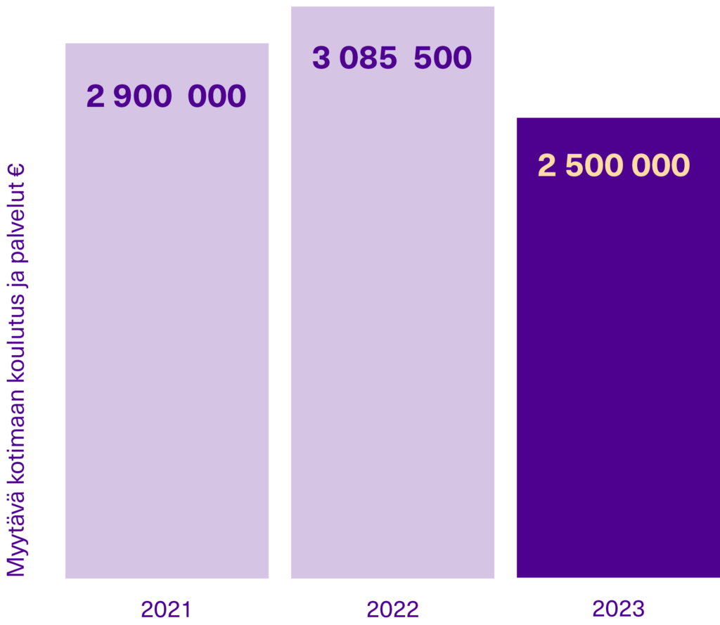 Kotimaan koulutuksen ja palveluiden myynti notkahti uudelleen vuonna 2023 ollen nyt 2,5 M €. Kansainvälisessä koulutuksessa kasvu jatkui edelleen sekä koulutusviennissä että tutkintoon johtavassa lukuvuosimaksullisessa koulutuksessa. Kansainvälisyyden lukuja esitellään tarkemmin Kansainvälisyyden avainluvut -sivulla.