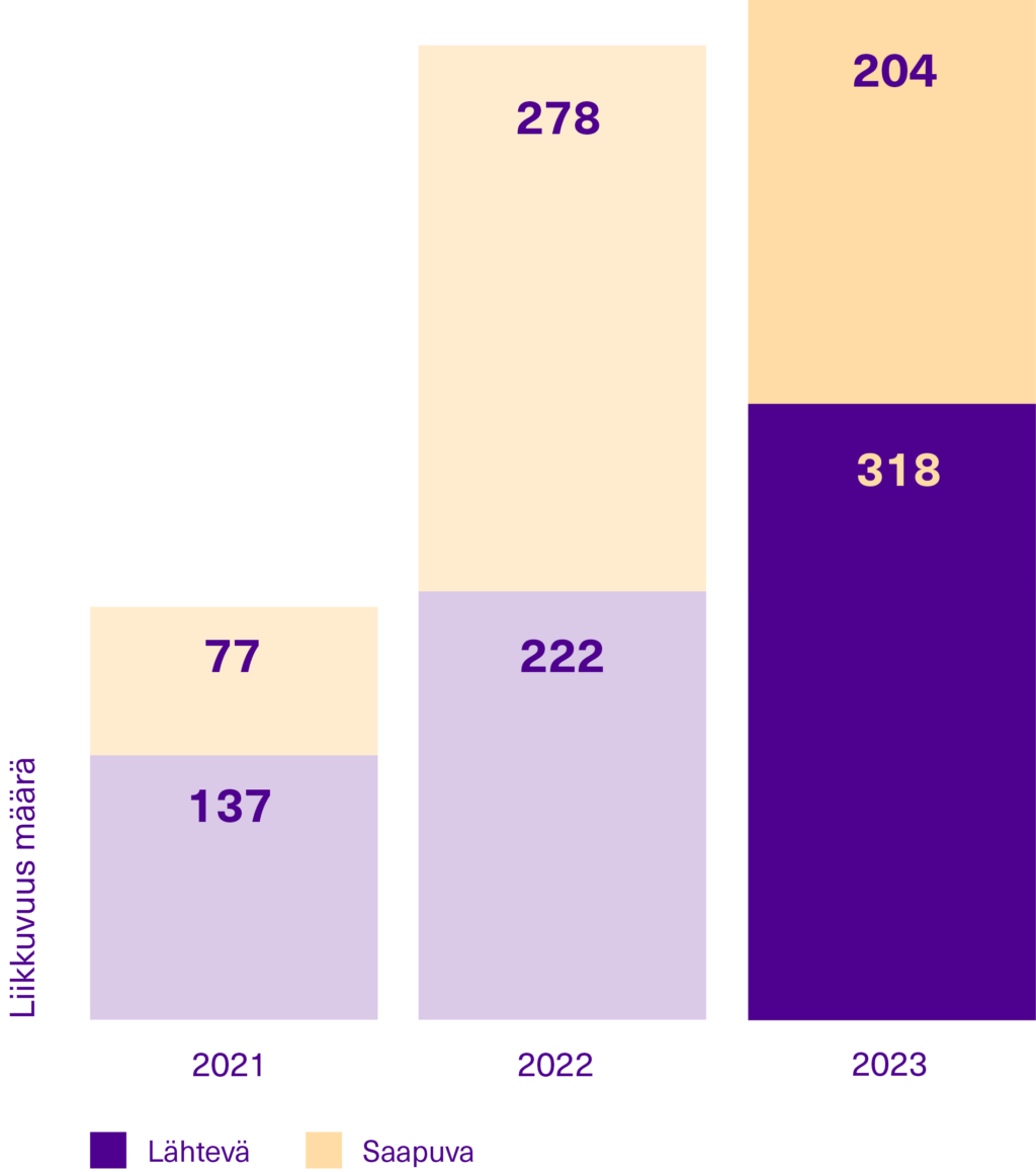 Henkilöstöliikkuvuuksien määrä jatkaa elpymistä poikkeusvuosien jälkeen, vaikka vielä ollaankin kaukana koronaa edeltävästä tasosta (vuonna 2019 sekä lähteviä että saapuvia oli 577, yhteensä 1154). Henkilöstöliikkuvuuden tilasto on tehty opetus- ja kulttuuriministeriön määrittelykriteerien mukaisesti. Kriteerien ulkopuolelle jäävät konferenssimatkat, joita vuonna 2023 oli yhteensä 43 kpl (v. 2022 58 kpl).