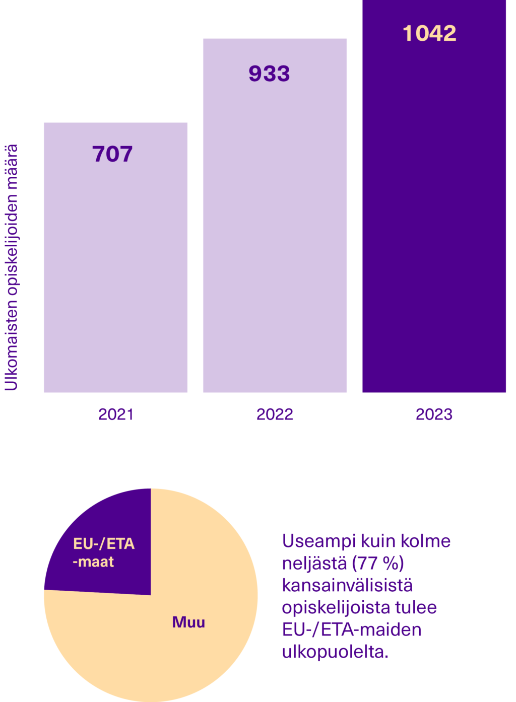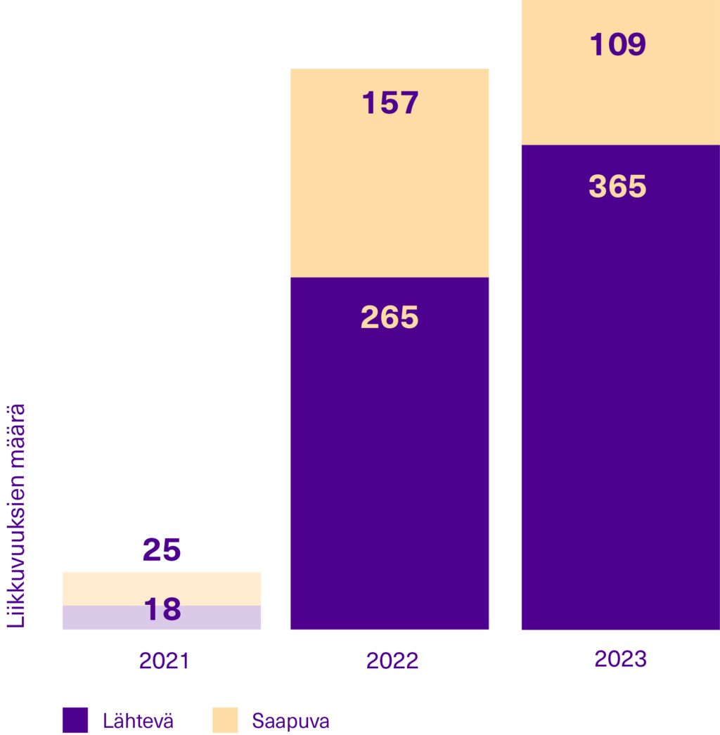 Erityisesti vaihtoon lähtevien opiskelijoiden määrä on ollut nousussa vuoden 2021 notkahduksen jälkeen. Koronaa edeltäneen ajan tilanteesta ollaan silti edelleen kaukana: vuonna 2019 lähteviä opiskelijaliikkuvuuksia oli 892 ja saapuvia 415.