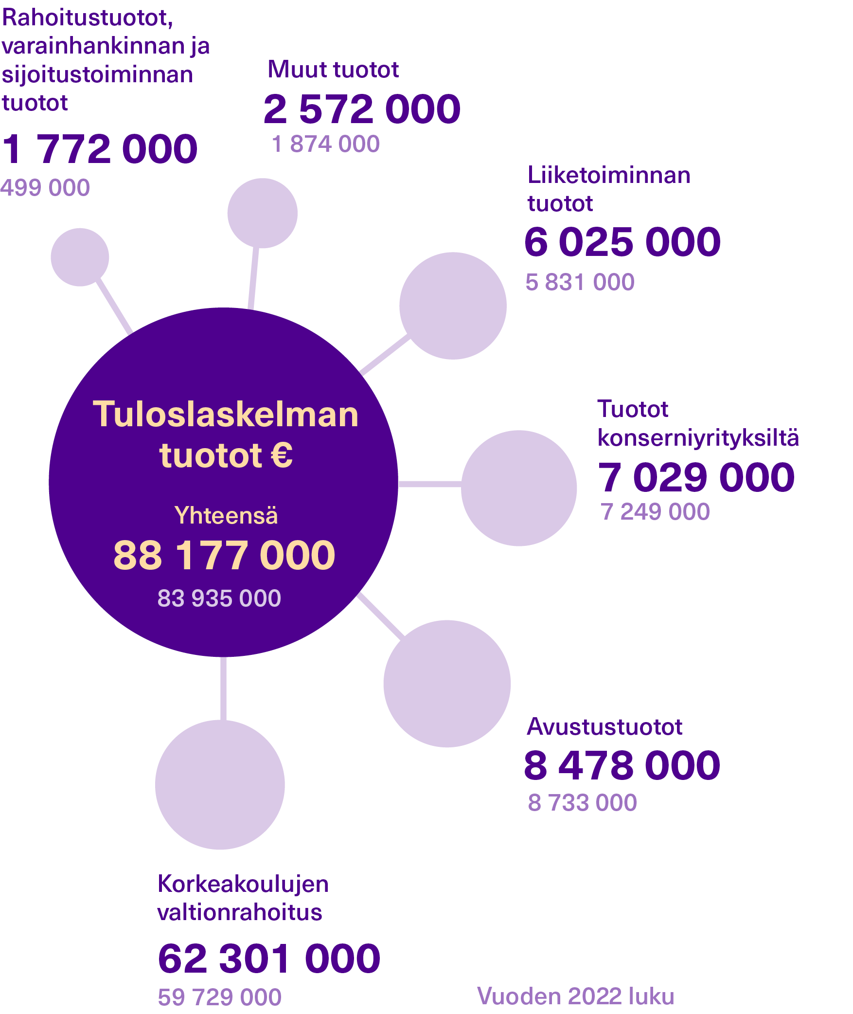 Poikkeuksellinen vuosi nosti TAMKin tulosta, vaikka varsinaisen toiminnan kulut kasvoivat aikaisemmista vuosista. Vuoden 2023 varsinaisen toiminnan tulos muodostui budjetoitua paremmaksi, ylijäämäksi muodostui + 6,1 miljoonaa euroa tavoitteen ollessa + 1,6 miljoonaa euroa. Liikevaihdossa oli kasvua edelliseen vuoteen noin 3 miljoonaa euroa, josta valtionrahoituksen osuus 2,6 miljoonaa euroa. Ulkoisen rahoituksen kasvu edelliseen vuoteen verrattuna oli 0,4 miljoonaa euroa, joka kertyi pääosin lukuvuosimaksutuloista. Ulkoisen TKI-rahoituksen osuus pysyi edellisvuoden tasossa. Ulkoisen rahoituksen projekteista 43 % oli rakennerahastohankkeita (ESR ja EAKR). Liiketoiminta kasvoi noin 3 prosenttia edelliseen vuoteen verrattuna, vaikka kansainvälisestä tutkintokoulutusten tilauskoulutuksesta luovuttiin.