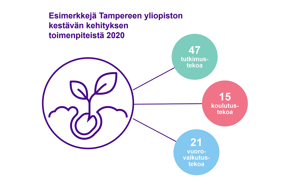 Tampereen yliopiston kestävyyteen tähtäävät toimet ja teot vuonna 2020 kategorioittain