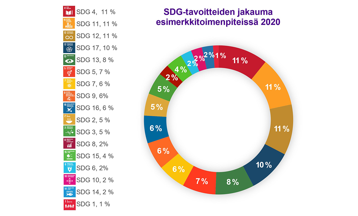 - Olemme tehneet selkeyden nimissä yksinkertaistavia jakolinjoja: raja tutkimus-, koulutus- ja vuorovaikutustekojen välillä ei ole aina selkeä; aineistossa on tietueita, jotka voisi luokitella niin sosiaalisen ja kulttuurisen, ekologisen kuin taloudellisenkin vastuullisuuden piiriin; erityisesti jako SDG:iden välillä on vaikeaa, sillä valtaosa toimista vaikuttaa useampaan kuin yhteen tavoitteeseen. Ajattelemme kuitenkin yksinkertaisen mallin tukevan erityisesti niitä, joille SDG-ajattelu on vielä tuntemattomampaa.