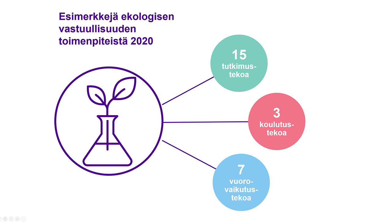 Syksyn aikana toteutettiin koko korkeakouluyhteisön ensimmäinen hiilijalanjälkilaskenta kaikkien keskeisten päästölähteiden osalta. Merkittävimmät päästöt syntyvät matkustuksesta, kiinteistöistä sekä tutkimusinfrastruktuureista.