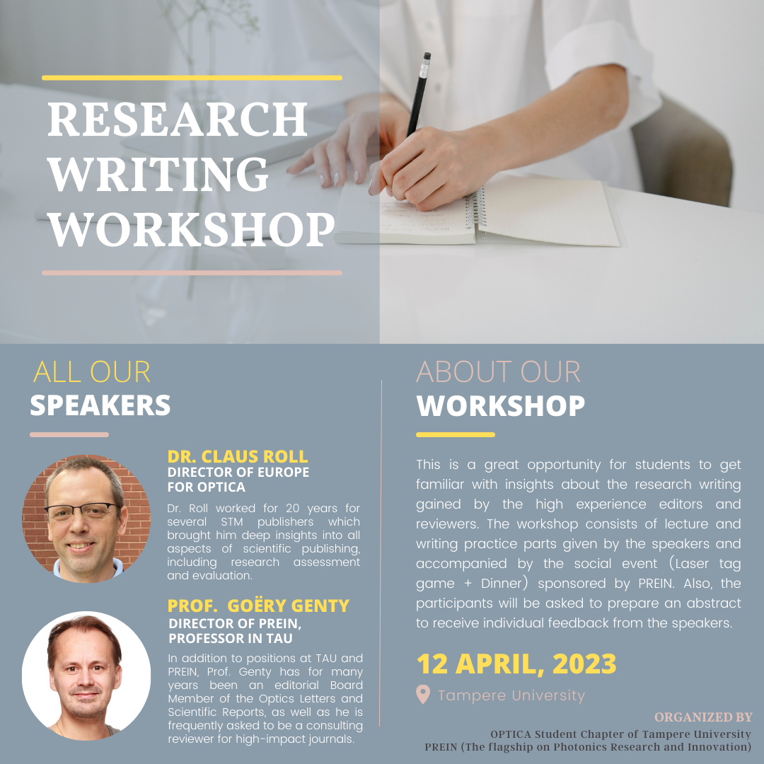 The “Workshop on Research Writing” organized by Optica Student Chapter together with PREIN support took place on the 12th of April at Tampere University.