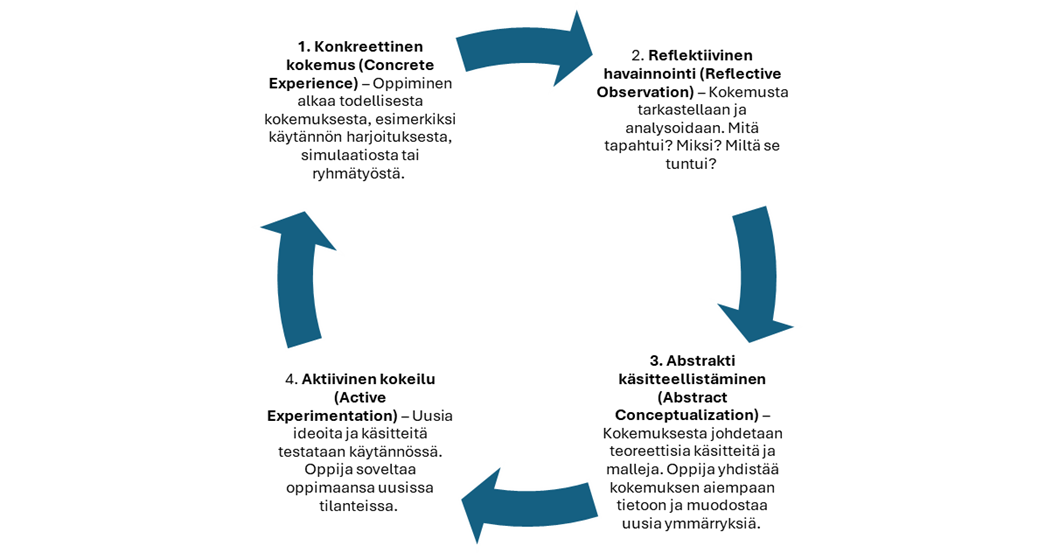 Kolbin (1984) kokemuksellisen oppimisen malli perustuu ajatukseen, että oppiminen on prosessi, jossa tietoa rakennetaan oppijan omien kokemusten kautta. Malli koostuu neljästä vaiheesta, jotka muodostavat syklisen oppimisen kehän (kuvio 1):