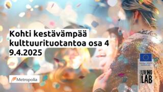 Kohti kestävämpää kulttuurituotantoa -koulutuskokonaisuuden ensimmäinen osa keskiviikkona 5.2.2025 klo 9-12 Metropolian kampuksella: Oppimistila 1 AR 323 (Arabian kampus, Hämeentie 135, 00560 Helsinki).