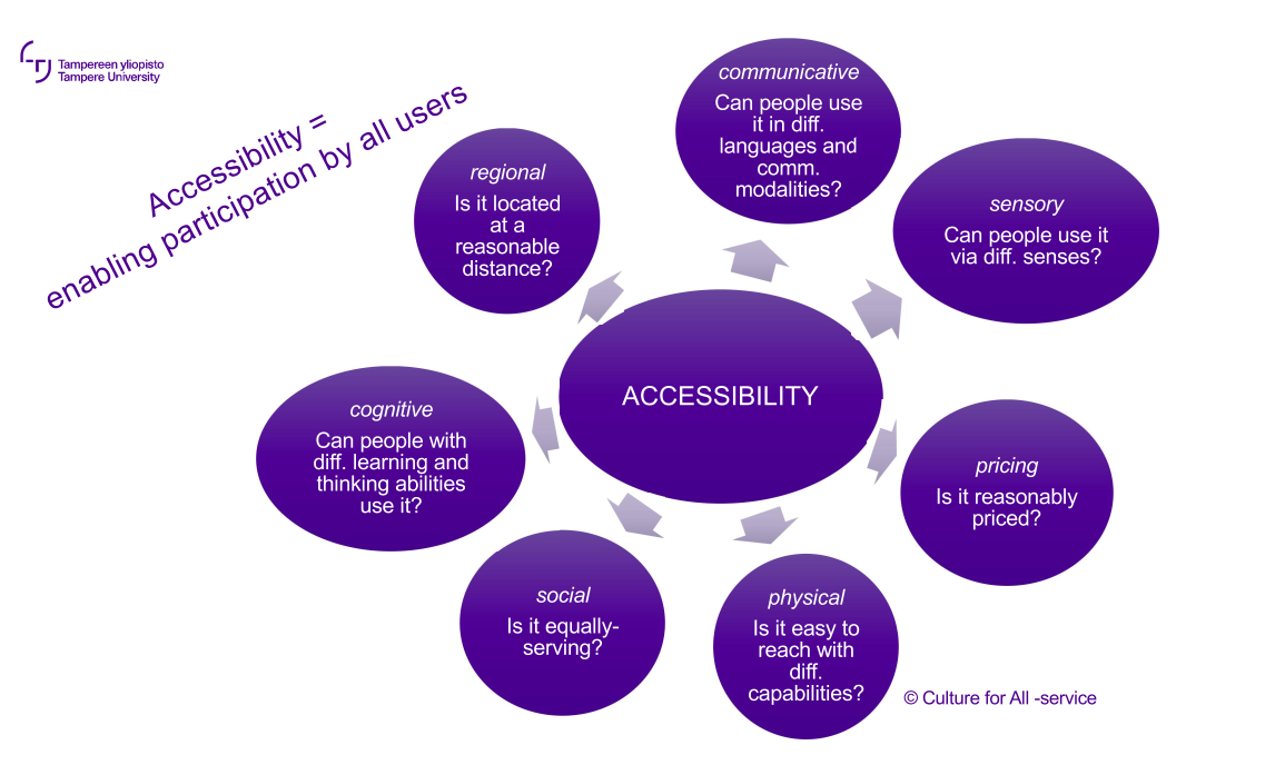 This illuminating chart was included in Maija Hirvonen’s presentation on the fourth lecture. In it, accessibility is defined as ‘enabling participation by all users’. It is a good, comprehensive definition, but when this idea is taken into the real world and applied to public services, culture, and all other fields of life, it is not surprising that executing “design for all” is not at all easy.