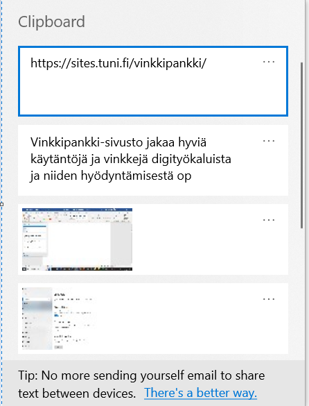 Kun painat yhtäaikaa Windows-näppäintä ja v-kirjainta, niin esiin ponnahtaa ikkuna, jossa näet aiemmin kopioimasi tai leikkaamasi asiat, myös kuvankaappaukset. Voit valita ehdotetuista kohteista, että minkä haluat tekstiisi liittää.