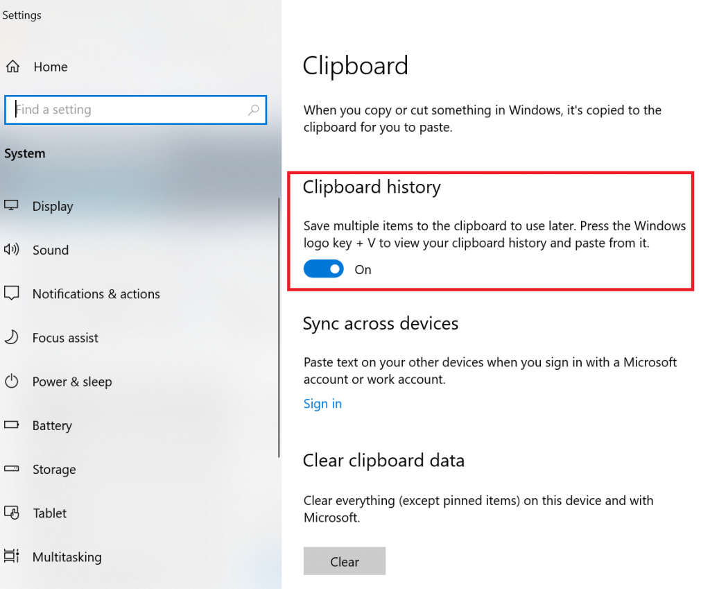 Valitse Settings (asetukset) – System (Järjestelmä) – Clipboard (Leikepöytä)