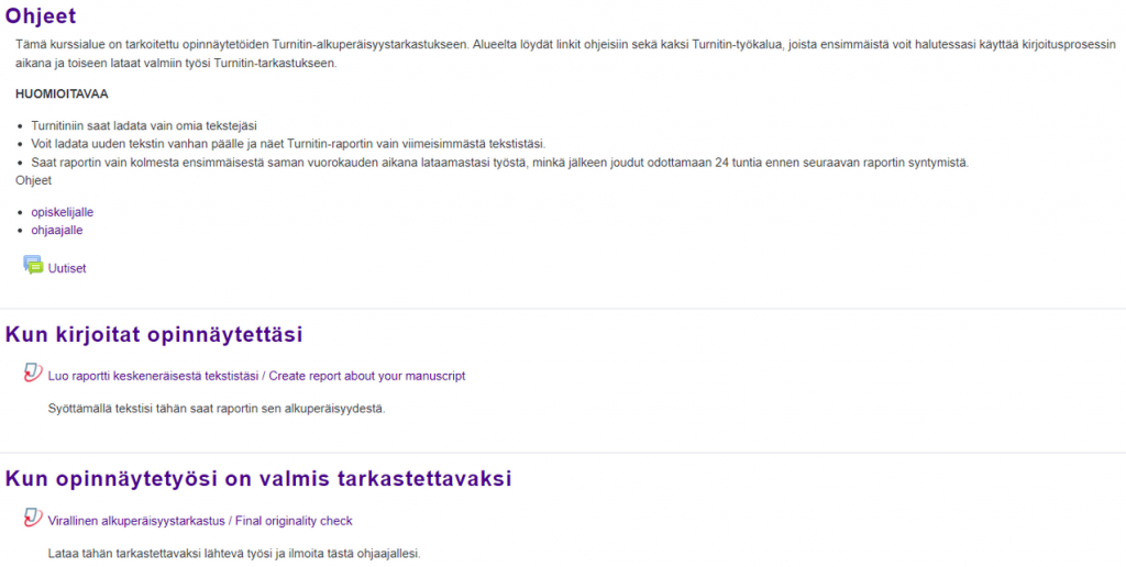 Turnitin-mallipohja on tarkoitettu opinnäytetöiden ohjaukseen ja sisältää valmiina Turnitin-alkuperäisyydentarkistustyökalut.