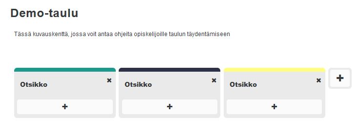 Opiskelijat voivat lisätä sisältöä tauluun klikkaamalla otsikoiden alla olevia +-painikkeita. Tekstin lisäksi korttiin voi lisätä linkin, kuvan tai YouTube-videon.