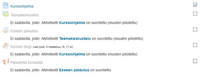- Näytä tämä kohde suoritetuksi kun ehdot täyttyvät: Opettaja määrittelee, millä ehdoilla aktiviteetti katsotaan suoritetuksi. Ehdot voivat olla erilaiset eri aktiviteettien kohdalla (esim. keskustelualue: viestien kirjoittaminen, tehtävä: palautus)