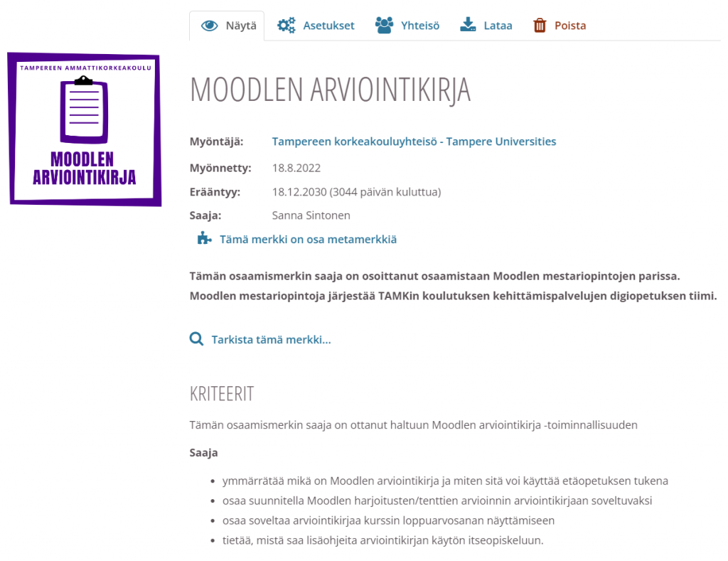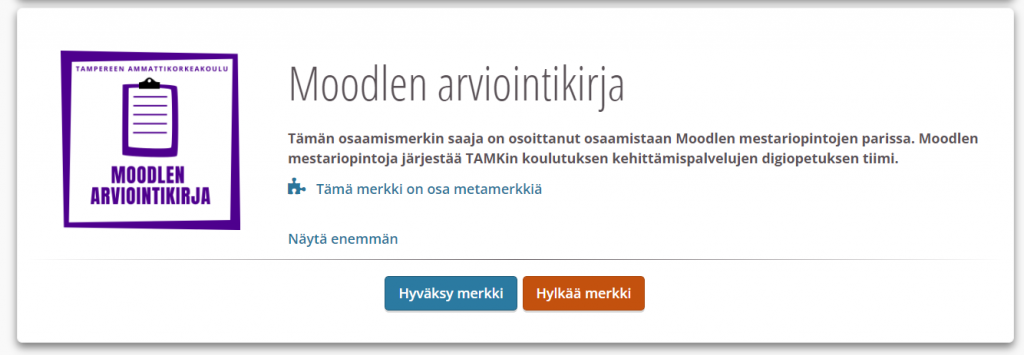 Osaamismerkkien vastaanottamista voi kokeilla esimerkiksi osoittamalla osaamistaan TUNI Moodlen käytössä Moodlen mestariopinnoissa.