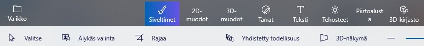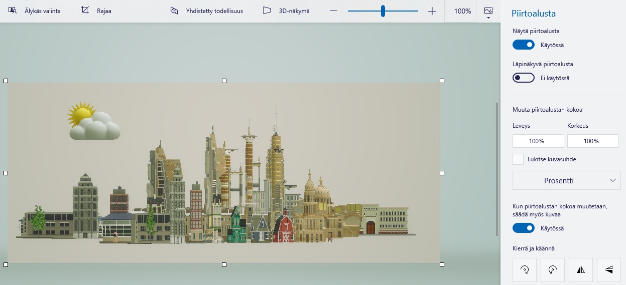 Huom! Ilman piirtoalustaa Älykäs valinta -työkalu ei ole klikattavissa, eivätkä 2D-objektit näy. Objektien siirto ja valinta on kuitenkin mahdollista rajaamalla objektit hiirellä vetämällä.