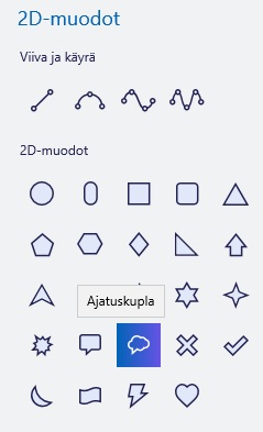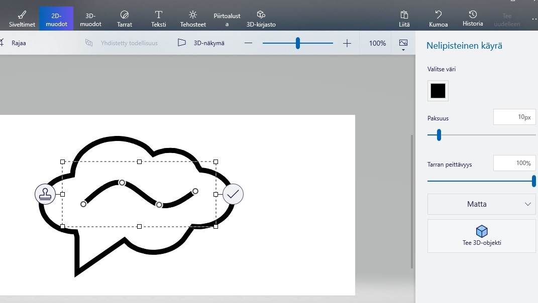 Yksinkertaisia 2D-muotoja on Paint 3D:ssa on saatavilla jo valmiina. Viiva- ja käyrätyökalujen ansiosta muotoilu on helppoa. Käyriä voi apunappien avulla säätää haluttuun muotoon. Klikkaamalla Tee 3D-objekti -painiketta saat tehtyä kaksiulotteisesta objektista kolmiulotteisen, sekä käänneltyä objektia eri kulmista katsottavaksi. 2D-muotoja voi yhdistää myös kolmiulotteisiin kuviin.
