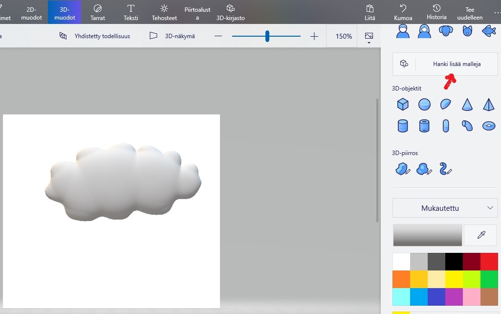 Kun haluat lisätä kolmiulotteisen kuvan, löytyy ohjelmasta liuta valmiita 3D-muotoja. Voit myös muuntaa itsetehtyjä tai valmiita 2D-objektejasi kolmiulotteisiksi, tai piirtää vapaalla kädellä. Alla olevan kuvan pilvi muuntui 3D-objektiksi napsauttamalla Tee 3D-objekti -painiketta. Saatavilla on sekä pehmeä- että kovareunaisia piirtotyökaluja, joita voi valita käyttöönsä kohteesta riippuen.