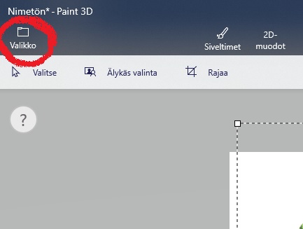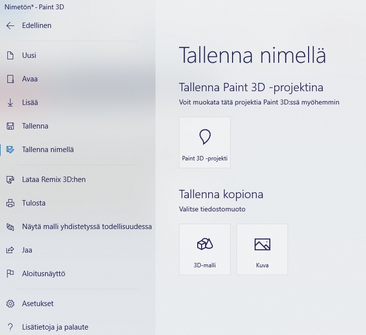 Tallentamaan luomuksiasi pääset vasemman yläkulman ”Valikko”–painikkeesta –> ”Tallenna nimellä”. Mikäli haluat muokata objektia vielä myöhemmin Paint 3D:ssa, valitse tallennusmuodoksi Paint 3D -projekti. Jos olet valmis ja haluat käyttää luomustasi esim. tavallisena kuvana, valitse tallennusmuodoksi Kuva.