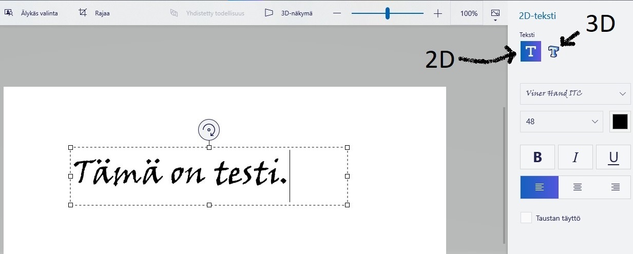Lisää tekstiä 2D- ja 3D -työkaluja käyttämällä. 2D:ta käyttämällä teksti sijoittuu piirtoalustalle (myöh. tässä postauksessa lisätietoja piirtoalustasta). 3D taasen antaa mahdollisuuden kolmiulotteiseen tekstiin ja täten myös tekstin eri suuntiin kääntelylle.