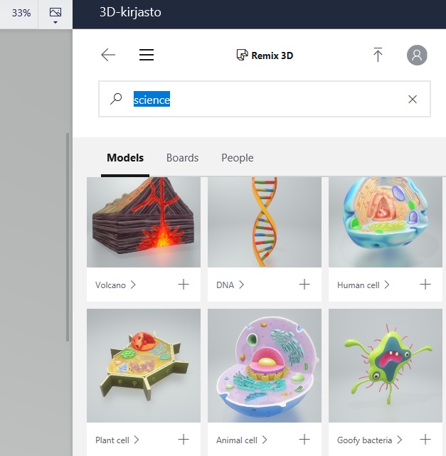 Mikäli et halua itse luoda 3D-objektiasi, voit klikata Hanki lisää malleja -painikkeesta. Tällöin sivulle aukeaa Remix 3D-kirjasto, josta voit hakea itse mieluisiasi objekteja.