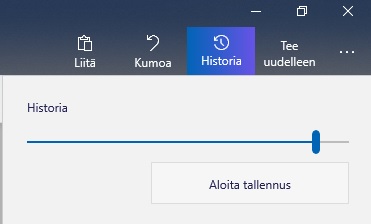 Historia-työkalu löytyy ohjelman oikeasta yläkulmasta. Työkalu nauhoittaa kaiken tekemisesi sovelluksessa. Liikuttamalla säätönappia eteen- tai taaksepäin pystyt kelaamaan eri työvaiheiden välillä. ”Aloita nauhoitus” -toiminnolla pystyt nauhoittamaan ruututoiminnastasi videon muille jaettavaksi.