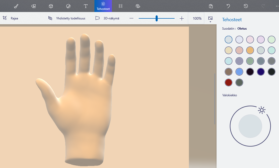 Tehosteiden avulla muokata kuvan tunnelmaa luomalla valoja ja varjoja. Oikealta voit valita värimaailman ja valokiekon avulla voit säätää valonlähteen suuntaa 3D-kuvissa.