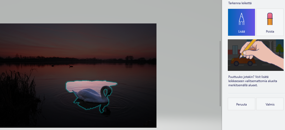 Aina eivät ohjelman valistuneet veikkauksetkaan mene aivan oikein, jolloin voit korjata reunoja joko lisäämällä tai poistamalla haluttuja alueita irrotettavaan objektiin. Lopuksi paina ”Valmis”.