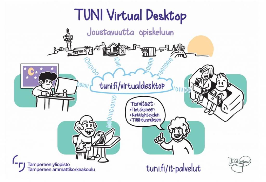 TUNI Virtual Desktop on palvelu, jonka kautta voit käyttää omalla tutulla tietokoneella samoja ohjelmia, joita olet aiemmin käyttänyt tietokoneluokan tietokoneelta. Ohjelmistot on asennettu virtualisointialustalle, johon otat yhteyden omalta tietokoneeltasi. Tarvitset siis vain tietokoneen, nettiyhteyden ja TUNI-tunnuksen. Ohjelmisto on käynnissä virtualisointialustalla, mutta sen käyttö on hyvin samankaltaista kuin ohjelmiston ollessa asennettuna omalle tietokoneelle