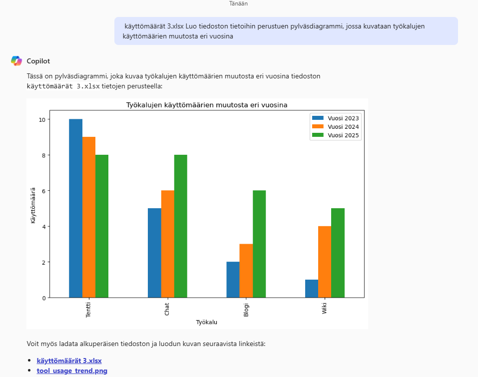 Copilot analysoi tiedoston ja luo pylväsdiagrammin annettujen tietojen perusteella. Huomioi, että Excelissä olevat tiedot tulee olla muotoiltu taulukon muotoon. Esimerkkivastauksessa Copilot antoi myös suoran linkin kuvan lataamiseen. Voit tallentaa kuvan myös kuvan päällä hiiren kakkospainikkeella. Voit promptissa eritellä tarkemmin minkälaisen diagrammin haluat ja rajata tarkemmin mitä tietoja käytetään.