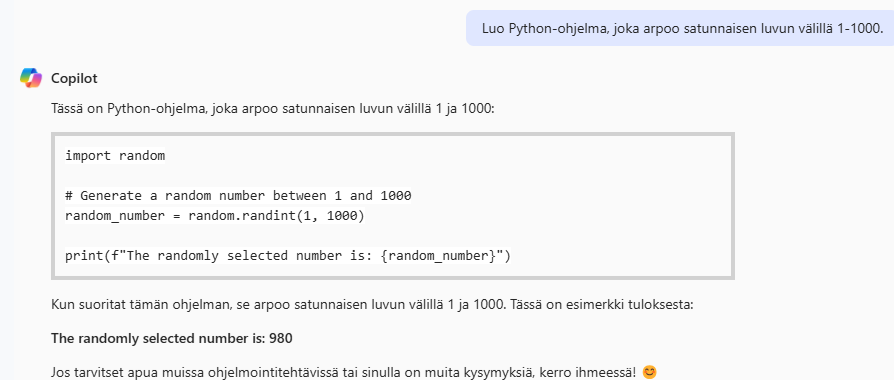 Copilot voi auttaa sinua myös koodin kirjoittamisessa eri ohjelmointikielillä. Voit pyytää Copilotia kirjoittamaan koodia tietyn tehtävän suorittamiseksi.