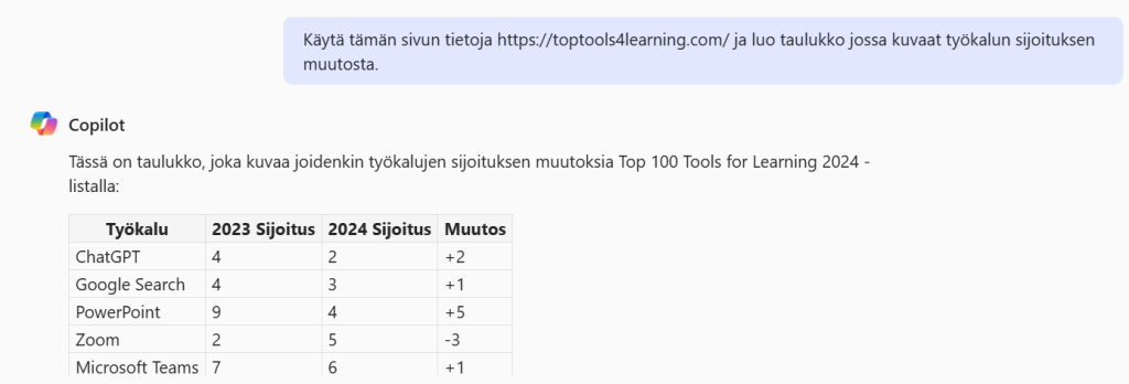 Taulukot ovat hyödyllisiä tietojen järjestämisessä ja esittämisessä selkeästi. Voit pyytää Copilotia luomaan taulukoita eri tietolähteistä. Voit määritellä promptissa mitä tietoja taulukossa käytetään ja miten ne asetellaan ja otsikoidaan.