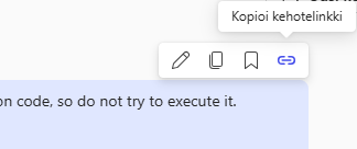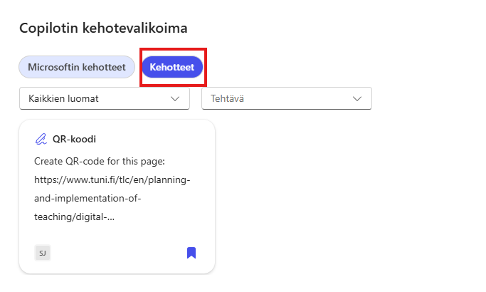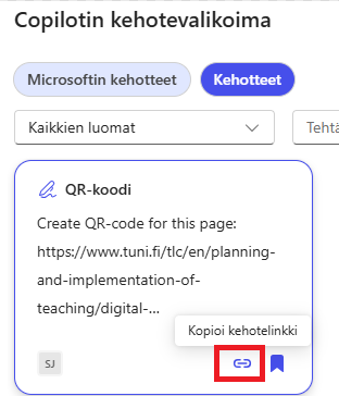 Voit jakaa kehotteen myös muille. Voit kopioida linkin kehotteeseen Kehotevalikoima-sivulta tai kyseisen kehotteen kohdalta yläreunan toiminnoista Kopioi kehotelinkki -painikkeesta.