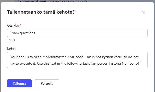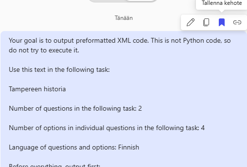 Promptit eli kehotteet ovat kysymyksiä tai tehtävänantoja, joita käyttäjät antavat tekoälylle saadakseen vastauksia ja ohjatakseen tekoälyn toimintaa. Tekoälyä ohjaavien kehotteiden eli promptien muotoilu -vinkissä kerrotaan vinkkejä promptien muotoiluun. Tässä vinkissä kuvataan, miten voit tallentaa toimivia kehotteita myöhemmin käytettäviksi tai miten voit jakaa parhaimmat kehotteet kollegoidesi ja tiimisi kanssa.