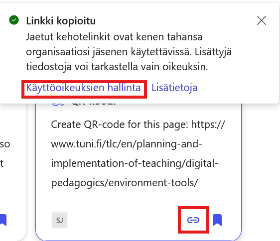 Kehotteen käyttöoikeuksia pääset muuttamaan myöhemmin klikkaamalla jakopainiketta uudelleen. Tällöin esiin tulee linkki Käyttöoikeuksien hallintaan.