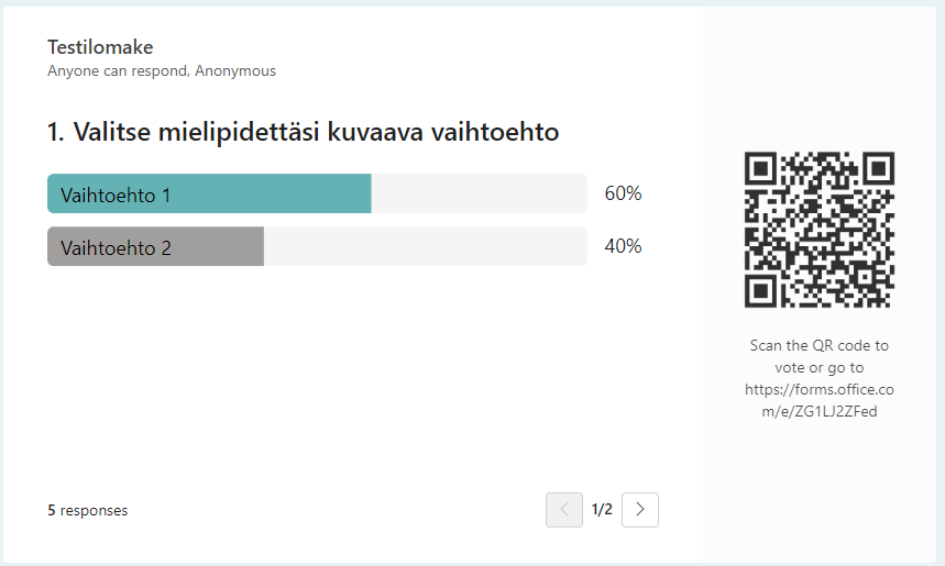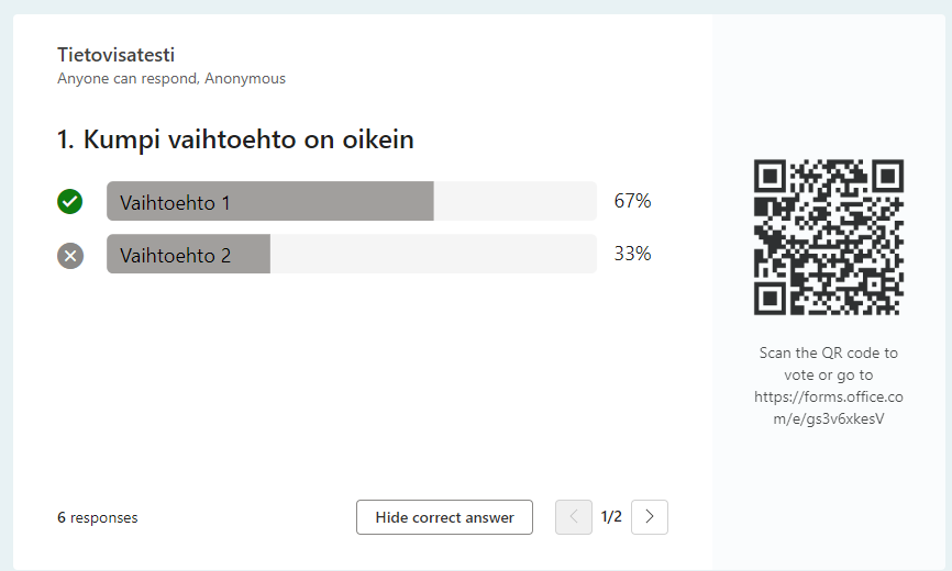 7. Osallistujat näkevät vastaamislinkin ja QR-koodin dian oikeassa reunassa ja kun vastauksia lähetetään ne päivittyvät reaaliajassa sivulla olevaan kysymykseen. Jokainen lomakkeen kysymys sijoitetaan omaan diaansa. Vastaamisen aikana pidä kyseinen dia näkyvissä, jos haluat, että vastaukset alkavat näkyä osallistujille. Jos haluat näyttää vastaukset vasta vastaamisen jälkeen. Vaihda dia vastaamisen ajaksi pois näkyvistä.